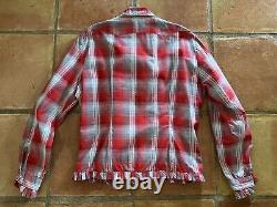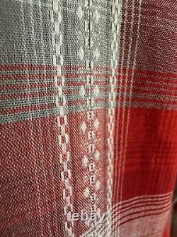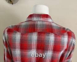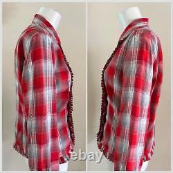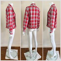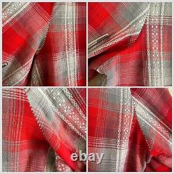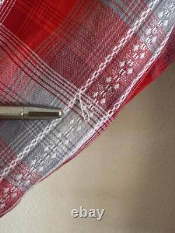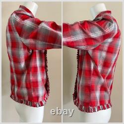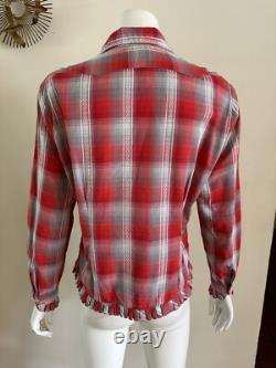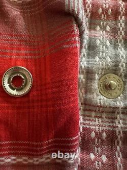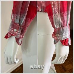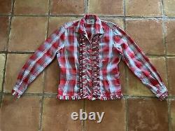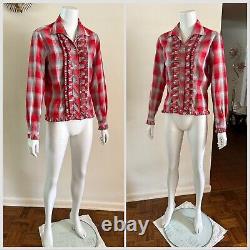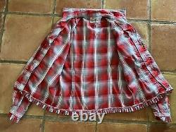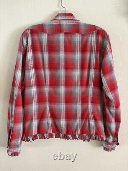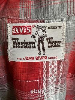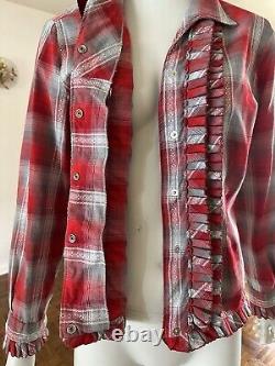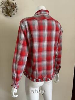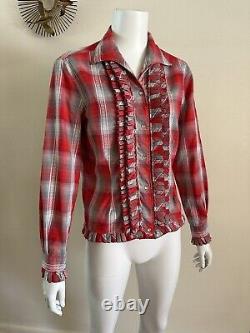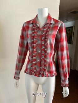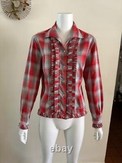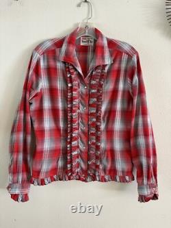 Vintage'Levis Western Wear' big E women's plaid ruffled pearl snap shirt with metallic silver thread. "It's a Dan River Fabric". Fits like a modern M/L. The shoulders measure like a Medium, while the bust is more like a Large. Would accommodate a busty medium or a size large that is not broad in the shoulders.