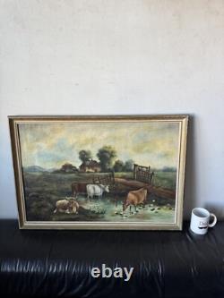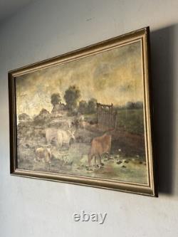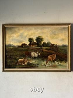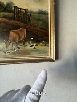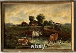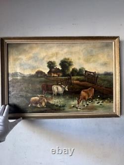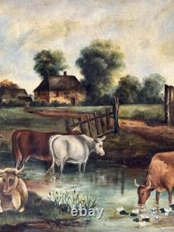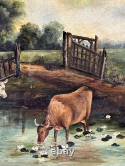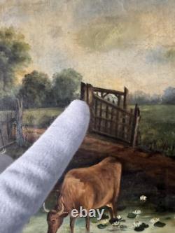 19th Century Antique Cattle Landscape Impressionist Oil Painting Old Cows Cowboy