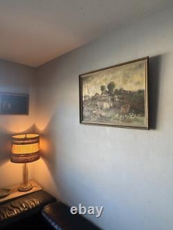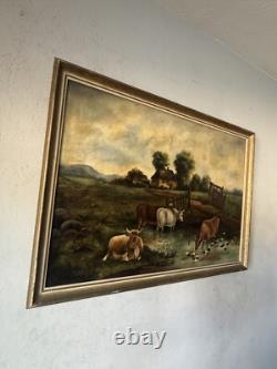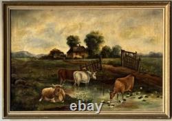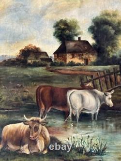EXCEPTIONAL ANTIQUE 19TH CENTURY CATTLE LANDSCAPE IMPRESSIONIST OIL PAINTING ON CANVAS. THIS WORK DEPICTS A SERENE PASTORAL SCENE OF CATTLE GRAZING BY A POND FRAMED BY SOFT ROLLING HILLS. THE ARTIST'S SOFT, PAINTERLY BRUSHSTROKES CAPTURE THE PEACEFUL HARMONY OF RURAL LIFE WITH A RUSTIC FARMHOUSE NESTLED AMONG LUSH GREENERY IN THE BACKGROUND. IT APPEARS TO BE UNSIGNED.