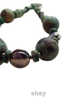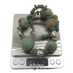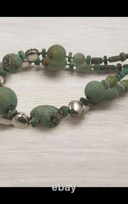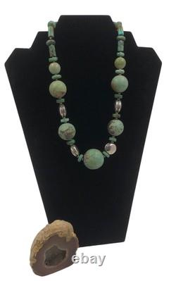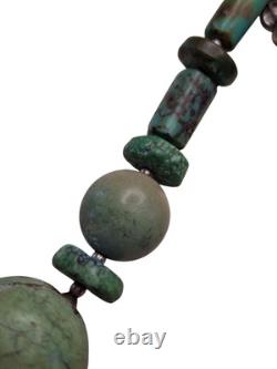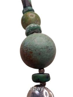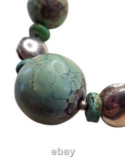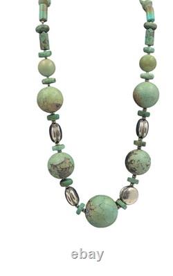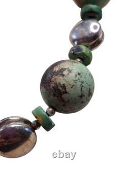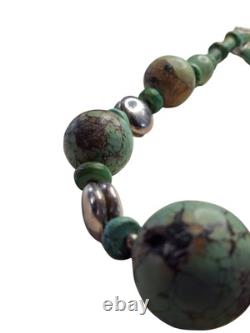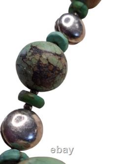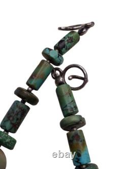 This necklace features a graduated strand of natural turquoise beads, ranging in size and shape from discs and cylinders to round and oval forms. The turquoise exhibits a range of green hues with matrix patterns, indicative of its natural origin. These are interspersed with sterling silver accents, including fluted beads and saucer-shaped spacers, adding a metallic contrast and enhancing the overall design.The necklace is strung on a sturdy cord, ensuring durability and longevity. This piece is a testament to traditional craftsmanship, blending the organic beauty of turquoise with the sleek elegance of silver, making it a striking statement of Native American jewelry.