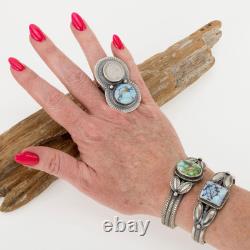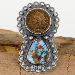 This Ring features a Natural Golden Hills Turquoise cab, and an Authentic, Antique 1883 Indian Head Penny, finely set into this large, dramatic SQUASH BLOSSOM ring. Featuring hand repousse silver work. GOLDEN HILLS Turquoise Ring W Antique 1883 Coin Robert Johnson Navajo 8 Sterling. From Our Yellowstone 1883 COLLECTION.