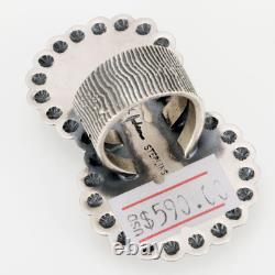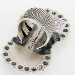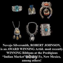 From Our Yellowstone 1883 COLLECTION By AWARD WINNING Navajo Silversmith, Robert Johnson. Robert was formerly trained by Master Navajo silversmith KIRK SMITH over 35 years ago. Roberts Old Style Silver work is very heavy and features many similarities and style ideas from the work of his teacher. Robert has recently won several Awards including an incredible award from the prestigious "INDIAN MARKET" in Santa Fe, New Mexico. Robert- I met the late Kirk Smith during the summer of 1986, Kirk mentored me on his style of silversmithing. Kirt taught me Traditional Navajo stamping with an antique finish, sometimes high polished pieces all of which started from bracelets, earrings, Concho belts, rings, squash blossoms, hair tie's and so forth. It was an exciting time of my life learning a new trade and being able to support myself and my family.