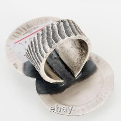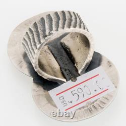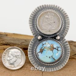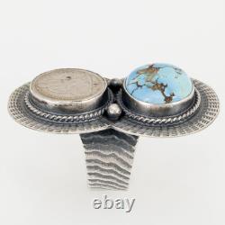 From Our Yellowstone 1883 COLLECTION By AWARD WINNING Navajo Silversmith, Robert Johnson. Robert was formerly trained by Master Navajo silversmith KIRK SMITH over 35 years ago. Roberts Old Style Silver work is very heavy and features many similarities and style ideas from the work of his teacher. Robert has recently won several Awards including an incredible award from the prestigious "INDIAN MARKET" in Santa Fe, New Mexico. Robert- I met the late Kirk Smith during the summer of 1986, Kirk mentored me on his style of silversmithing. Kirt taught me Traditional Navajo stamping with an antique finish, sometimes high polished pieces all of which started from bracelets, earrings, Concho belts, rings, squash blossoms, hair tie's and so forth. It was an exciting time of my life learning a new trade and being able to support myself and my family. This Ring features a Natural Golden Hills Turquoise cab, and an Authentic, Antique 1883 Seated Dime, finely set into this large, dramatic SQUASH BLOSSOM ring. Featuring hand repousse silver work. GOLDEN HILLS Turquoise Ring W Antique 1883 Coin Robert Johnson Navajo 9 Sterling. From Our Yellowstone 1883 COLLECTION. By AWARD WINNING Navajo Silversmith, Robert Johnson.
