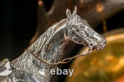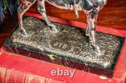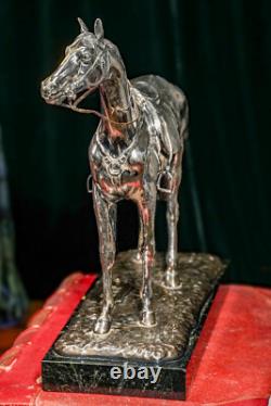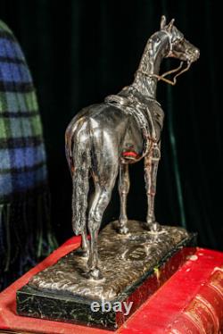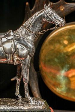 It is mounted on a sleek, polished green marble base. Circa 1920, there is no makers marks on this but we believe it was produced by Jennings Brothers as we have had similar statues in our collection in the past. Good antique condition, lights signs of age-related wear and areas of dark tarnish. Please review the photos for further condition assessment. Perfect for a study, office, library, or equestrian-themed decor, this statue makes an elegant focal point on a desk, mantel, or display shelf.Its substantial weight and timeless design exude sophistication, making it a thoughtful gift for collectors, horse enthusiasts, or anyone who appreciates refined, classic decor. Whether complementing a rustic, traditional, or luxurious interior, this equestrian statue serves as a captivating symbol of strength, grace, and elegance. Check out our other curated antique listings.