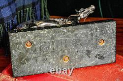 The polished metallic finish enhances its regal presence, creating a stunning contrast against the deep green marble base. The initials "ETB" on a small plaque are subtly inscribed on the base, adding an intriguing touch of history and uniqueness. This impressive piece measures 12 inches wide, 11.5 inches high, and 4.5 inches deep, and weighs a substantial 10 pounds.
