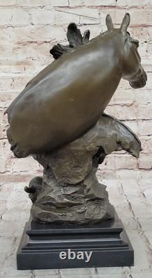 This sculpture is in perfect condition. Bronze Dimensions with Marble Base: Height 14" X Width 10". Marble Dimensions:6" X 6". Capturing a serene and powerful vision, this bust of a Native American and his horse conveys the essence of the Indian's culture, wisdom, and traditions. Every detail is meticulously crafted, from the braided, long, dark hair cascading down to the intricate strands of beads around the Indian's neck, showcasing the deep connection to heritage. The stoic complexion with its pronounced wrinkles adds a sense of resilience, embodying the enduring spirit of this cultural representation. Standing beside his favorite horse, the Indian's companion mirrors the calm strength seen in his owner. The horse's perky ears, dark and thick mane, and the tranquility expressed in its eyes echo the profound bond shared between man and beast.