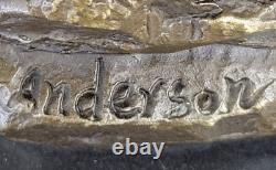 Crafted through the lost wax method, this sculpture exemplifies a dedication to preserving fine details and achieving a lifelike portrayal. Resting on a black marble base, the artwork finds a harmonious balance between artistic expression and stability, creating a captivating tribute to the unity of Native American culture and the natural world. Signed by the artist Anderson, this sculpture carries a distinctive mark of authenticity. The artist's signature not only certifies the craftsmanship but also adds a personal touch to the piece, connecting the viewer to the hands that brought this evocative portrayal to life. This bronze masterpiece stands as a testament to the rich tapestry of Native American heritage, encapsulating a timeless connection between humanity and the animal kingdom.
