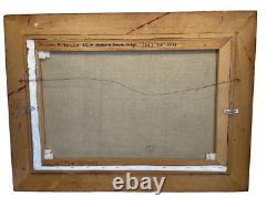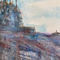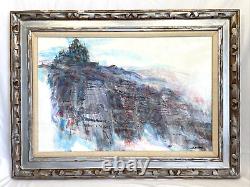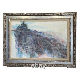 A palace or village mountain landscape painting on canvas. Very nice vintage condition with no damages, only normal signs of age with some minor staining to linen border in upper left corner as shown in close ups Measures 38x28 and is signed along with artist's writing on back of stretcher. Very interesting use of color and paint material.