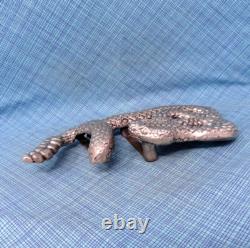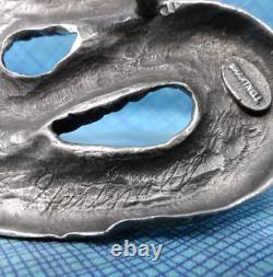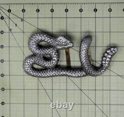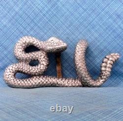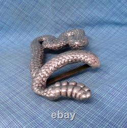 This is a large, heavy, 3D style silver tone metal buckle with detailed artwork, made to appear like it is wrapped around your belt and poised to strike, made & signed by Hartnell, from the 1980s. It is in pretty nice condition, as shown in the photos it does have some patina, and some wear and tear from age or use. It measures approximately 6-3/4" x 3-1/8", fits a 1-3/4 wide belt and weighs about 9 oz.
