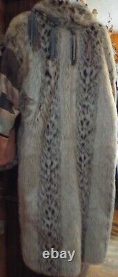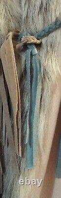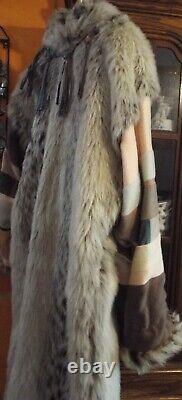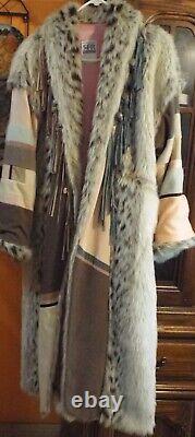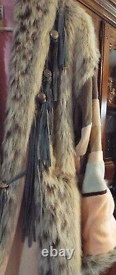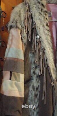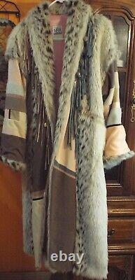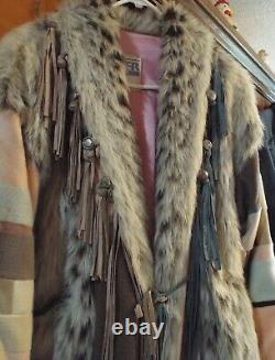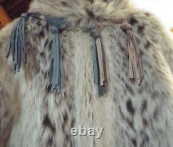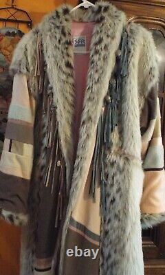 Fur around sleeves, complete fur on back and down both sides of front collar and neckline. Has fringe tassels hanging from back side of collar. The last photo is showing a tiny cut of lining, where a staple tore it when opening it out of the box when I bought it new. It's new, I've never worn it.