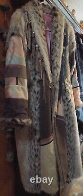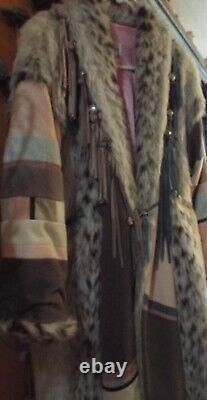 When I bought it was new never worn. 28" arm pit to arm pit, 53" length. It's Cotton, Wool, Rayon, Linen, Satin, Silk, Hand Painted Suede, Suede Leather, Nylon & Faux Fur. Comes from a smoke free home and stored in plastic and tote. Thank You for checking out this Listing.