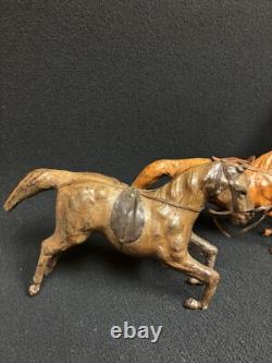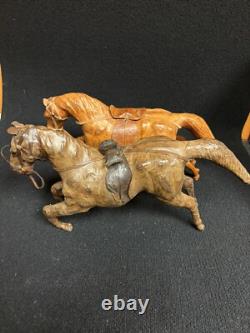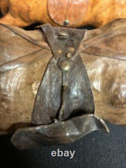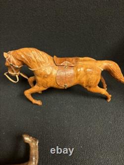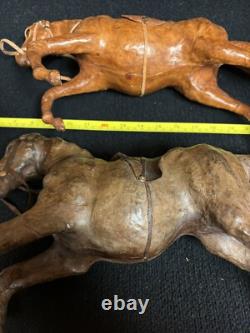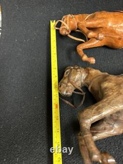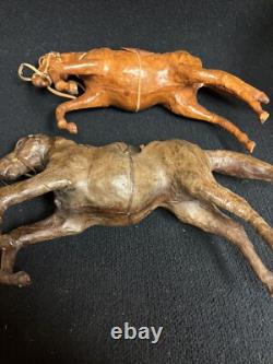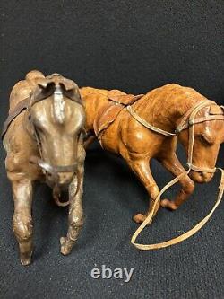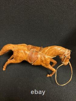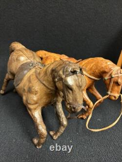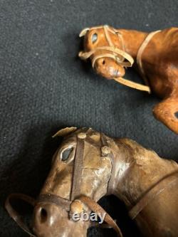 This unique collectible features a pair of vintage leather horses with glass eyes, accompanied by a saddle and reins. The provenance of this item is not available, but it is clear that it was handmade with great care and attention to detail. The culture of Western Americana is evident in every aspect of this piece, from the design of the horses to the intricate leatherwork of the saddle and reins. The country/region of manufacture is unknown, but it is clear that this item has been well-maintained and is in excellent condition. This antique Western memorabilia is perfect for collectors of unique and rare items, and would make a great addition to any collection.