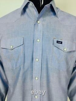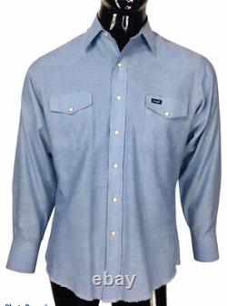 Vintage 70's Wrangler men's blue long sleeve, pearl snap front western Rockabilly shirt, no size/material label please refer to measurements for accurate fit. Approximate measurements taken with item lying flat armpit to armpit:23.5" shoulder to hem:32" (p1-19) great gently used item, this item is used vintage and may have barely visible imperfections due to normal wear, please look closely at all photos as this will be the best description of the item Please note colors may vary on different devices. Keywords: vintage, rockabilly, western, rare, hard to find, rodeo, ranchwear, pearl snap, cowboy.
