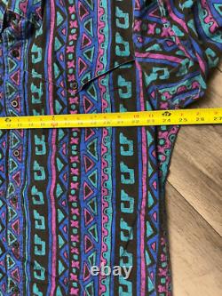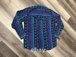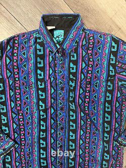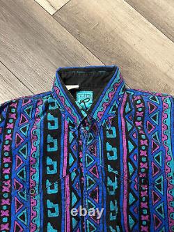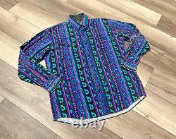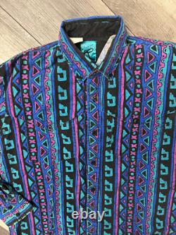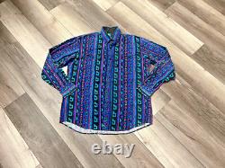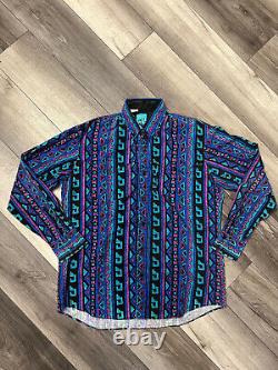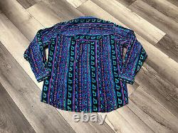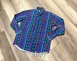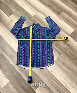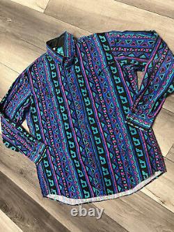 It features a unique Aztec Signs pattern in royal blue, turquoise, and purple multicolor with accents of turquoise. The shirt has a collared neckline, long sleeves, and a button-down closure. Made of cotton, it is machine washable and has a Western, rancher, cowboy theme.