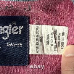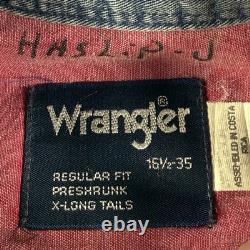 Material: 100% cotton, preshrunk (see tag in photos). Style: Classic Wrangler pearl snap Western shirt featuring bold multicolor Southwestern/Aztec stripes in red, denim blue, purple, turquoise, and green. Features two front snap chest pockets, pointed Western yoke on back, and extra long shirttails (X-Long Tails, per tag). Wrangler tag reads: Regular Fit, Preshrunk, X-Long Tails, size 16 1/2 x 35 (typically fits XL). Handwritten name "HASLIP J" inside collar (see detail photo).