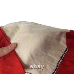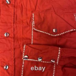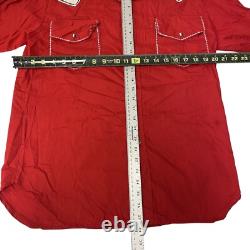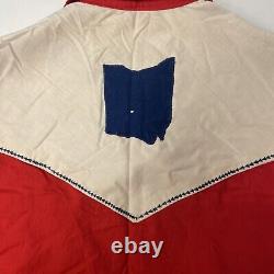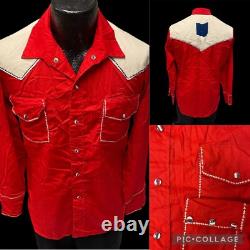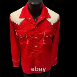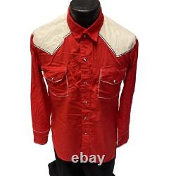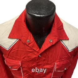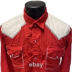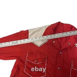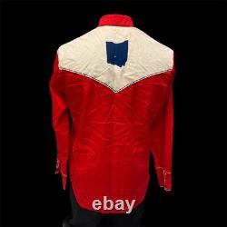 Has red white and blue pearl snaps Features. Made in Unknown Size: Mens M/L Condition: Pre-Owned Good Article is in excellent vintage condition. Has a few small faint spots, see photos for reference.